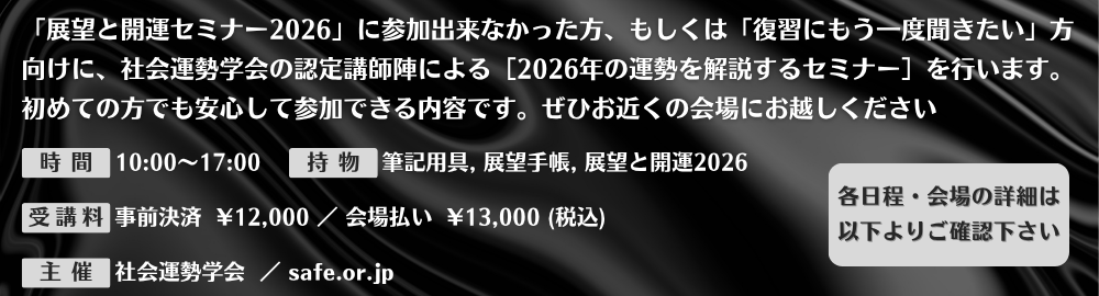 「展望と開運セミナー2026」に参加出来なかった方、もしくは「復習にもう一度聞きたい」方向けに、社会運勢学会の認定講師陣によるセミナーを行います。